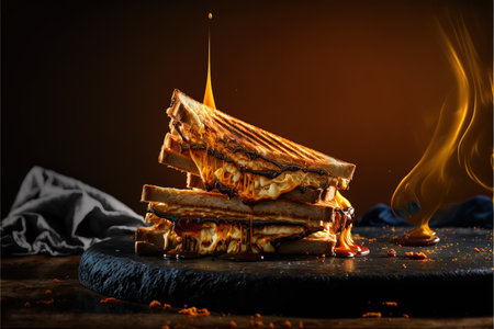 Tasty hot sliced bread sandwich with melted cheese on fire. AI generated