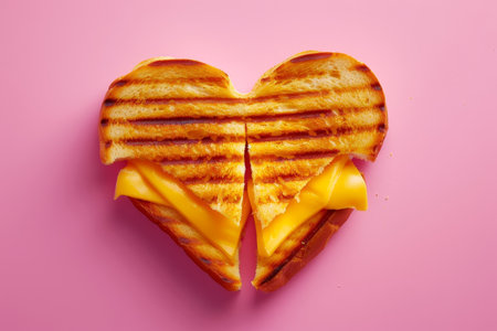 Heart-shaped grilled cheese sandwich on pink banner - romantic lunch snack for a special date night