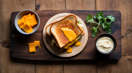 Overhead shot displays a gooey grilled cheese with cheddar on wood board with dip, ready to be enjoyed for comfort food photography.