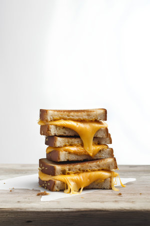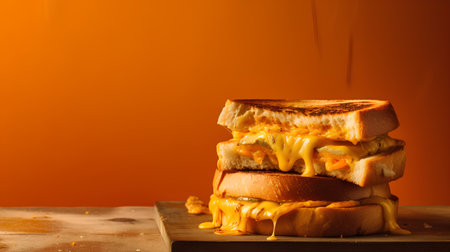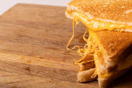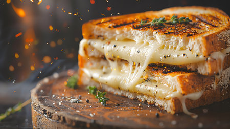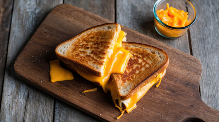 Mouthwatering grilled cheese sandwich oozes with cheddar on a rustic wooden board Great for comfort food and recipe content.