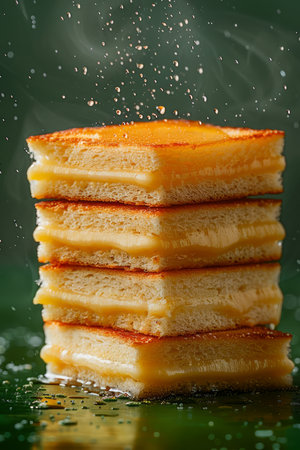 Delicious melted cheese sandwich stacked on a blue background, showcasing golden toasted bread and gooey cheese. Perfect for food lovers and culinary enthusiasts.