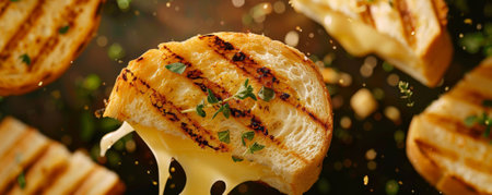Grilled cheese sandwiches with melted cheese, flying in the air with grill marks and herbs.ai generated