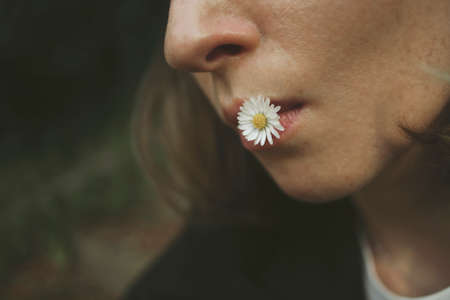 Close-up portrait of woman with daisy in mouth. Summer concept image.