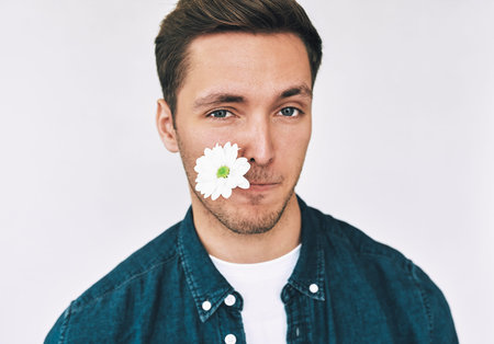 Closeup portrait of attractive man smiling with a flower in mouth posing over white wall. Attractive male model with white flower with balnk copy speca for your promotional text. Mother's day.
