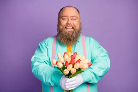 Portrait of positive cheerful man with big abdomen hold blossom tulips bunch he prepare for 8-march 14-february celebration wear turquoise pink suspenders isolated over violet color background