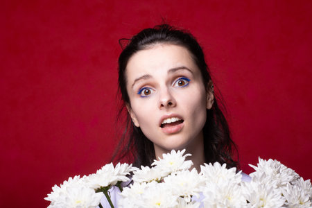 Portrait of young man with golden make-up holding a bouquet of red gerberas