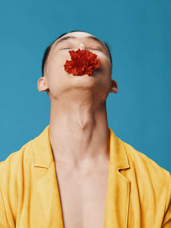 A young man with a red flower in his mouth tilted his head back against a blue background