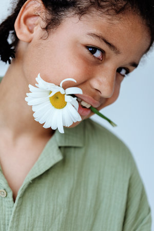 Innocence captured young boy holds a delicate white flower in his mouth, gazing confidently at the camera