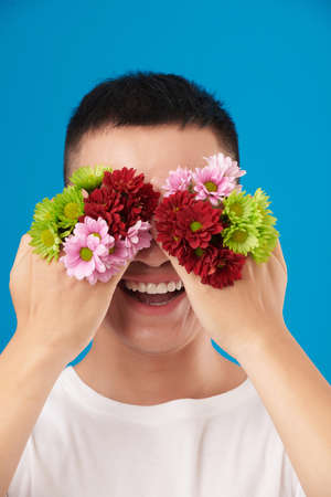 Portrait of happy excited young man holding beautiful blooming flowers in front of eyes