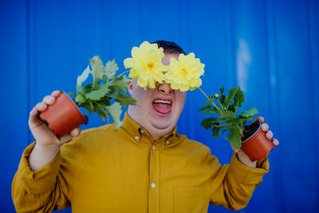 Happy young man with Down syndrome making funny grimace and holding pot flowers against blue background.