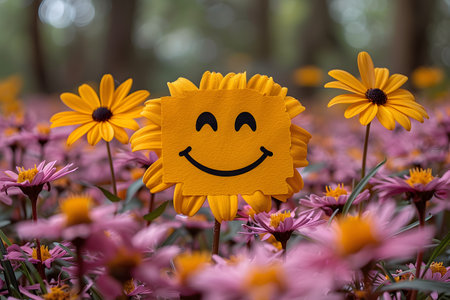 A vibrant field of pink and yellow daisies in full bloom, highlighted by a cheerful smiley face flower at the center. the serene background features soft green trees creating an uplifting and joyful atmosphere perfect for print, posters, or greeting cards. Generative AI