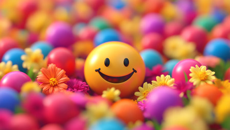 A radiant yellow smiley ball nestled amongst a burst of colorful flowers and balls