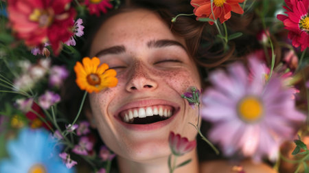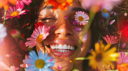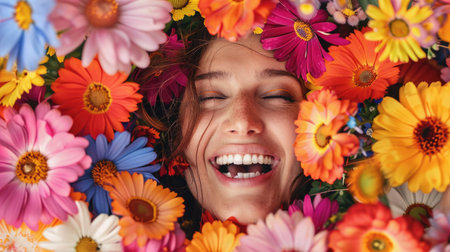 Close-up of a young womans face partially obscured by vibrant flowers, conveying a sense of beauty and nature. Enchanting Floral Gaze. lush summer floral arrangement, captivating gaze. AIG50