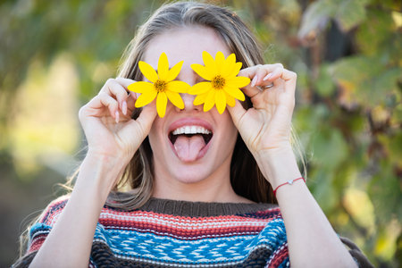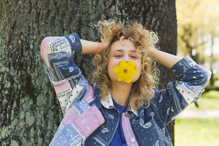 cheerful European young girl with a flower in her mouth touching her hair medium closeup outdoors well-being. High quality photo