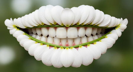 Abstract artistic representation perfect, healthy smile formed by flower petals and green stems against blurred