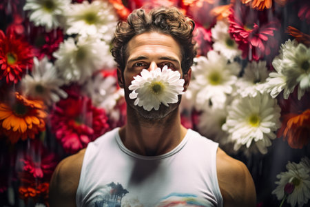 Blooming Elegance: The Man in a White Tank Top Adorned with Flowers - AR 3:2