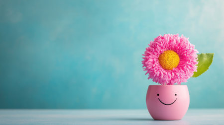 Pink flower in smiling pot on blue background