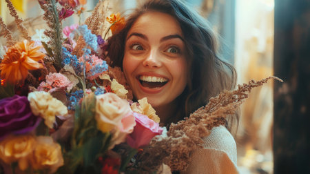 Excited woman with bright eyes holding a huge bouquet of mixed flowers generative ai