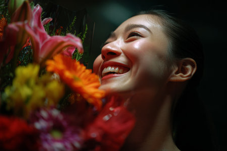 A close-up of a beaming ballerina illuminated by her joy as she holds a colorful bouquet of flowers after a captivating performance, showing her dedication and artistry.