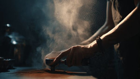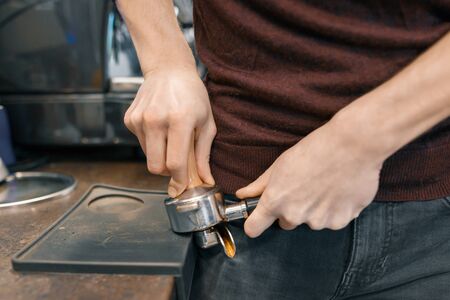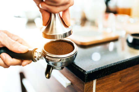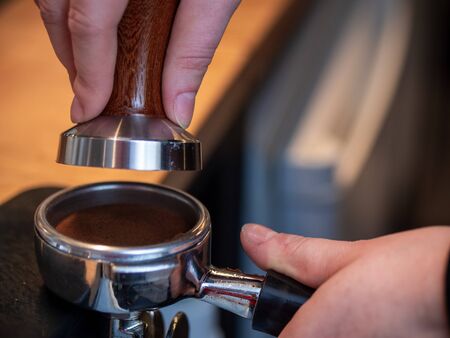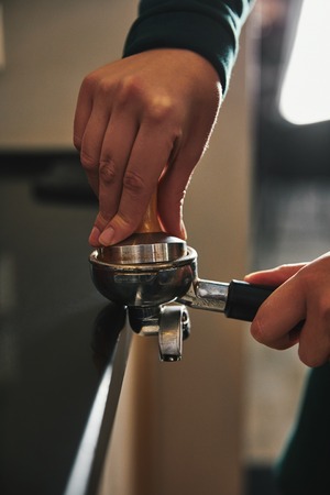 Closed up of barista’s hand tamping the portafilter before making fresh coffee in a coffee shop.