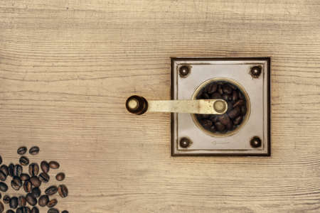 Coffee beans falling on wooden vintage hand coffee grinder. Grinding fragrant freshly roasted coffee