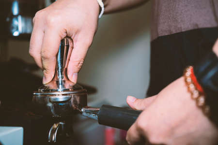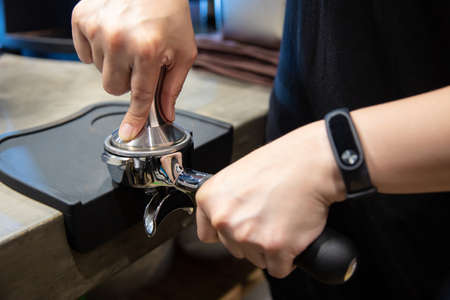 Close-up view on hands,Asian woman barista using tamper to press ground coffee into portafilter to make espresso hot drink