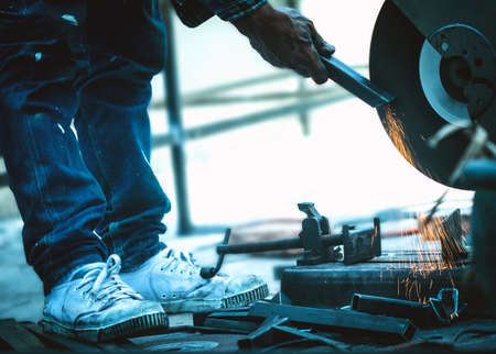 Mechanical man hand use electric grinder with flame sparks on metal business industry
