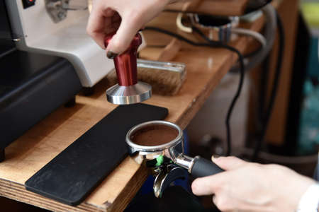 Barista using a tamper to press ground coffee into a portafilter. Coffee maker concept.