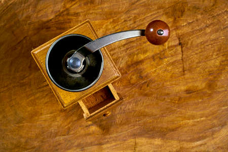 Vintage coffee grinder.Old retro hand-operated wooden and metal coffee grinder.Manual coffee grinder for grinding coffee beans. on the old wooden background.soft focus.