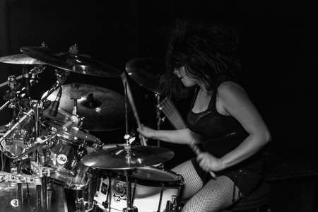 MINSK, BELARUS.September 1 , 2017 Rock band performs in a nightclub The girl shows the performance on stage