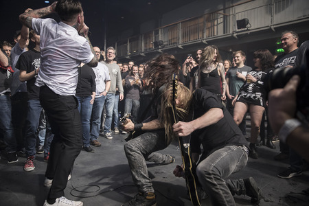 Amsterdam, The Netherlands - March 19, 2017: audience cheering while musicians of Norwegian hard rock band Audrey Horne plays in the crowd, support act of Canadian hard rock heavy metal band Danko Jones at Melkweg