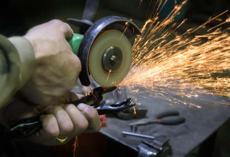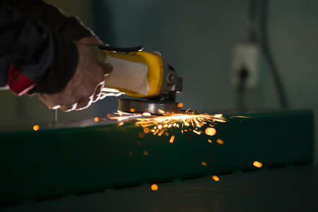 Grinding steel. Worker grind metal. work in garage. Electric tool in hand. Create flat surface.