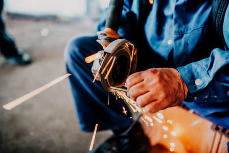 Worker working with a circular grinder on a metal with sparks flying out of them, selective focus