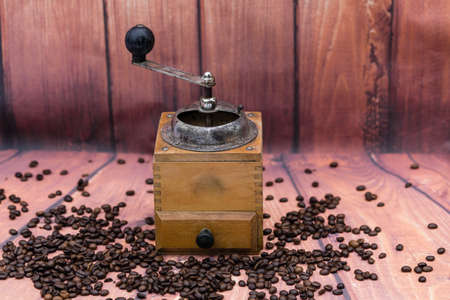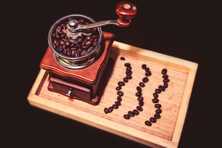 Coffee grinder with coffee beans on the reflective surface. Making coffee.