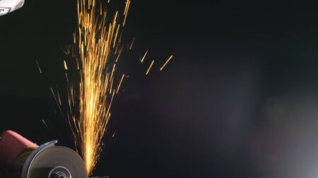 grinding cutting metal sheet with angle grinder machine and sparks, Close up.
