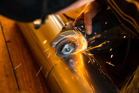 Heavy industry metal work worker using metal grinder machine sharpening a metal pipe close up.