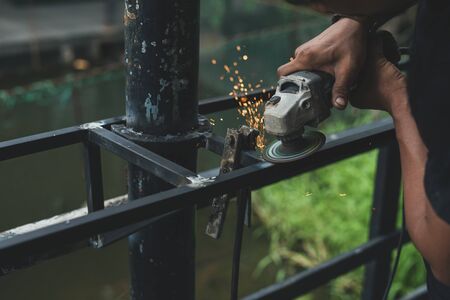 Worker man using electric wheel grinding and cutting on steel structure have spark from the grinding wheel at production industrial