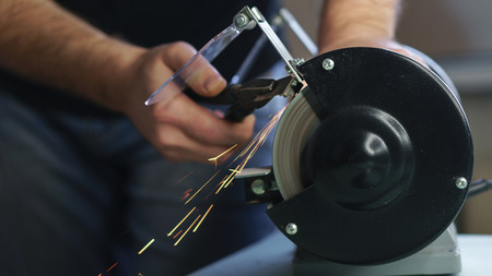 Krasnodar, Russia - October 10, 2011: A man sharpens a drill on emery