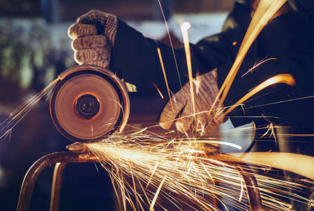 Worker cutting metal with grinder. Sparks while grinding iron