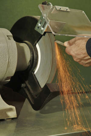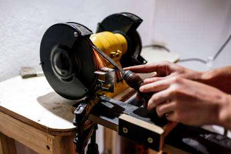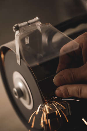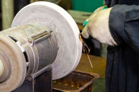 Manual sharpening of a tool on grinding machine with sparks close up