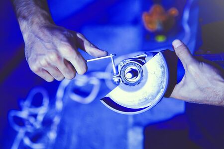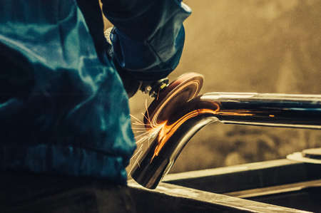 Metal polishing with a hand sander with a polishing disk. Toned image. Hand grinder workflow creation stainless pipe. working process with the sparks