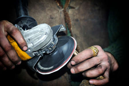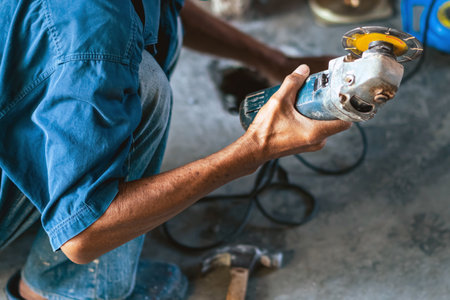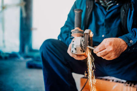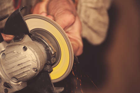 Closeup view of worker using a small grinder for cutting metal,vintage color tone.