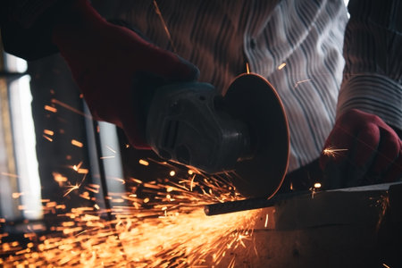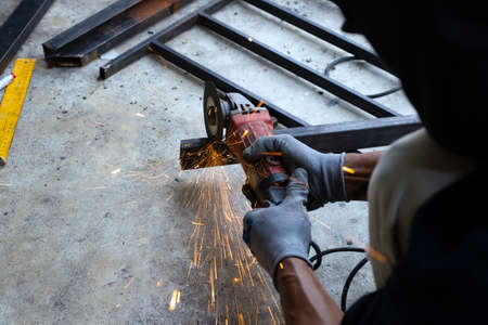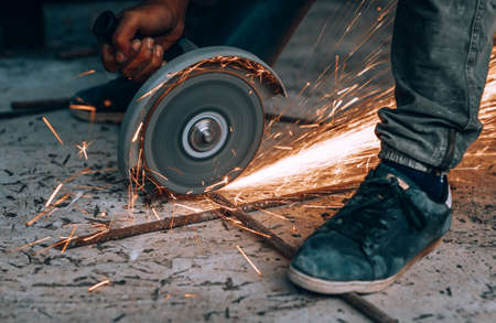 Craftsman sawing metal with disk grinder saw in workshop