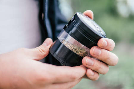Marijuana nature. White background. Mans hands marijuana bud. The sugar pot leaves on buds. cannabis buds in grinder. CBD THC herb. Sativa medical health. Harvest weed time.
