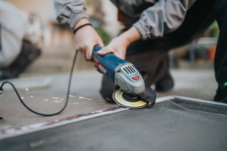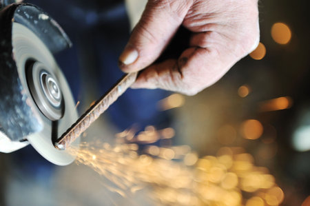 construction industry details - close up of metalworker using disc grinder for cutting metal