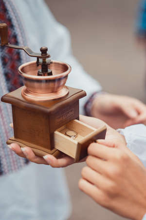 a man grinds coffee beans in a manual coffee grinder close-up. high quality photo