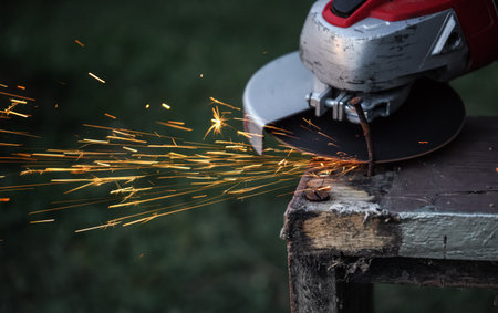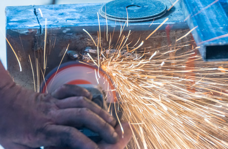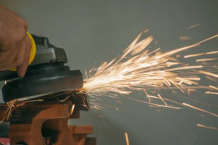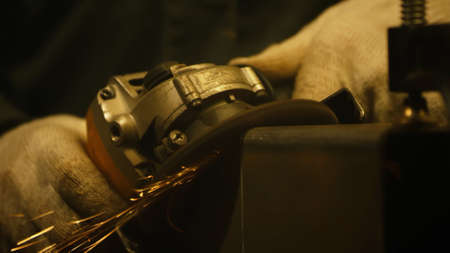 Mechanical man hand use electric grinder with flame sparks on metal business industry