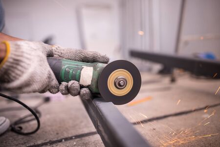 Profesional fabric worker cutting metal profile on the work table with an electric grinder in the industrial workshop.