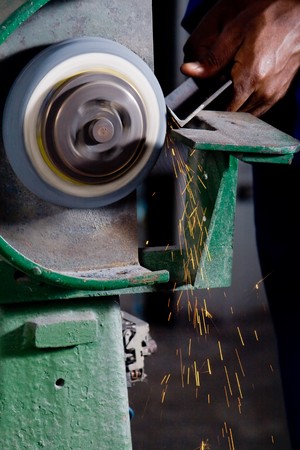 Manual labour - worker grinding the steel mechanism on the plant