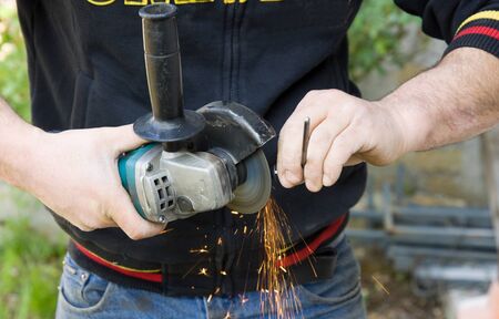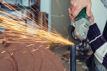 hand works with a manual grinder, flying sparks from grinding metal